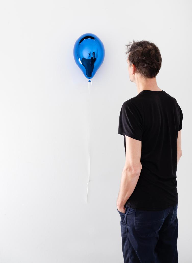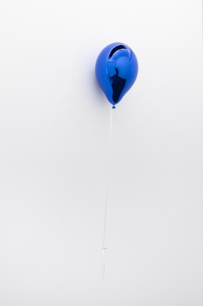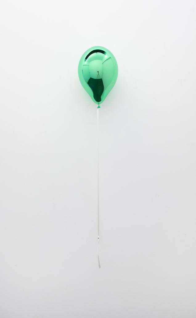 A coloured balloon seems to hover in front of a wall. Due to its shape and reflective surface, the balloon produces a distorted perspective of the surrounding space, similar to a fish-eye view. Only the ribbon attached to a nail seems to prevent the balloon from soaring into the air and expanding the reflection to the infinite.